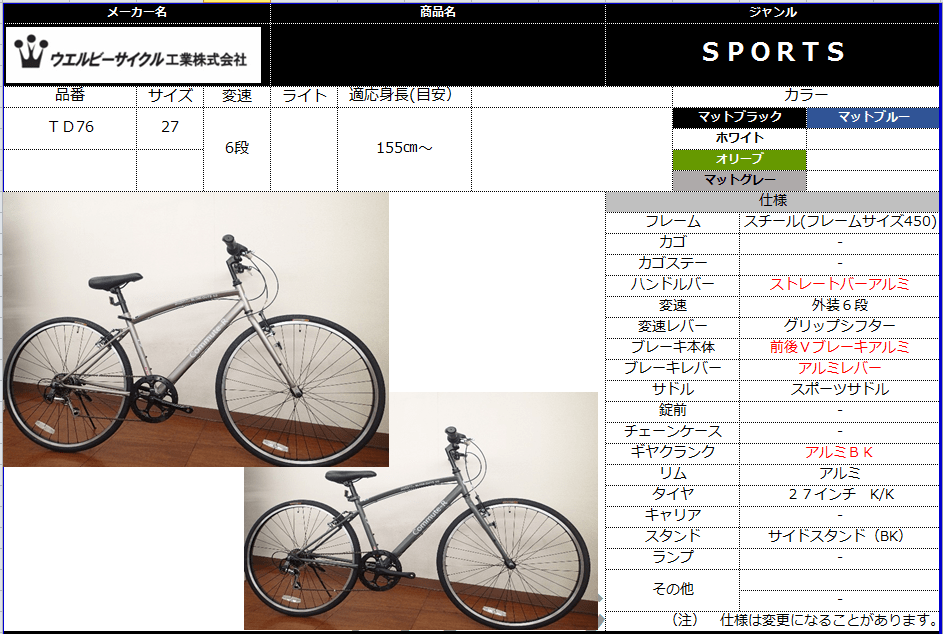 | ブレーキ本体 | 前後Vブレーキアルミ |