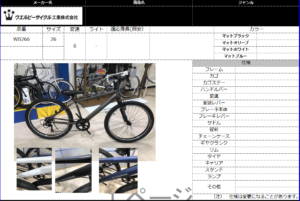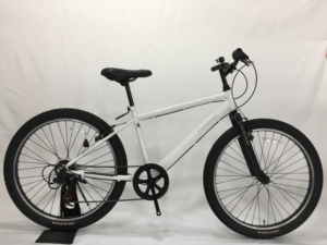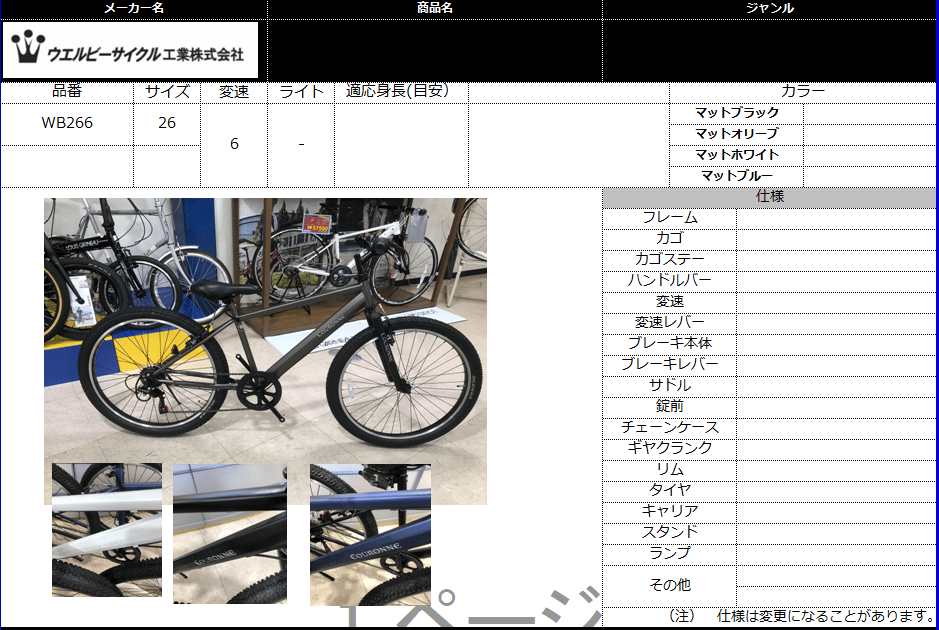 WB266 WB266 (wb266) 適応身長(目安)155㎝~ 設定カラー マットブラック マットオリーブ マットブルー マットホワイト 仕様 フレームスチールフレーム ヘッド ハンドルバー ハンドルポスト 変速シマノ外装6段 変速レバー ブレーキ本体前後Vブレーキ ブレーキレバー サドルスポーツサドル シートポスト チェーンケース ギアクランク フリー チェーン リムアルミリム タイヤ26X2.35 スポーク スタンドサイドスタンド 車種一覧